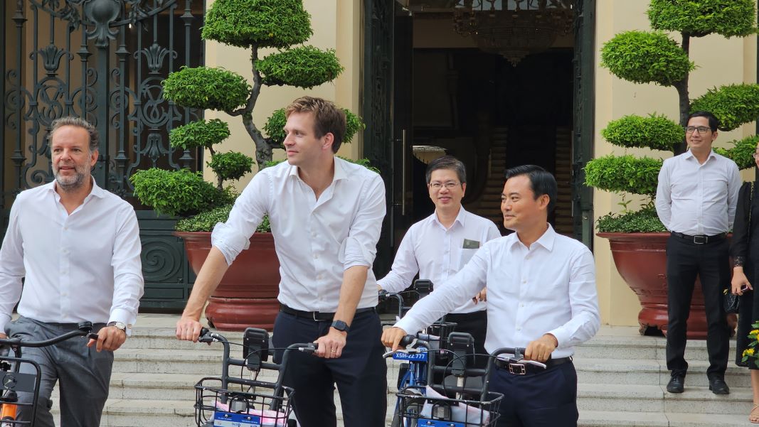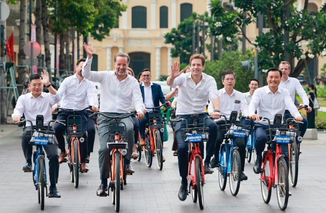 Following this high-level conference, the both sides took part in a cycling event on Nguyen Hue Street, and I was assigned to a new role: cycling with the group while interpreting for the leaders. This event and its images were covered by the official press.