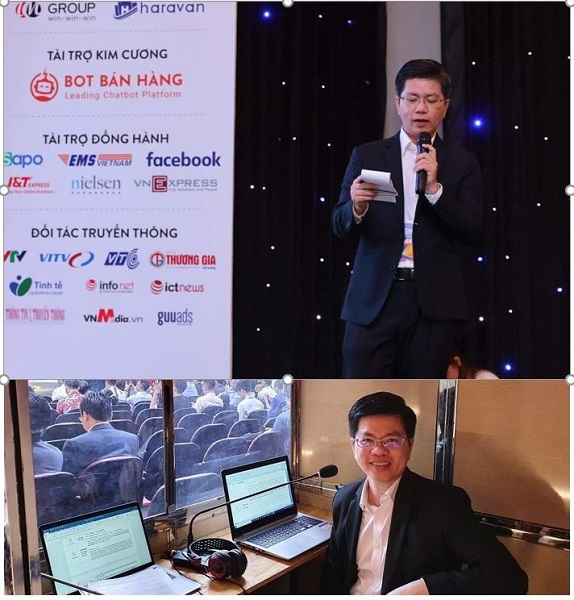 Trong hình là tôi - phiên dịch viên Khang Nguyễn - trên sân khấu, áp dụng kỹ năng ghi chú, dựng câu và truyền đạt nội dung theo bài trình bày (không có chuẩn bị trước) của diễn giả, trong đề tài chuyên biệt về Cashless Payment của VISA.