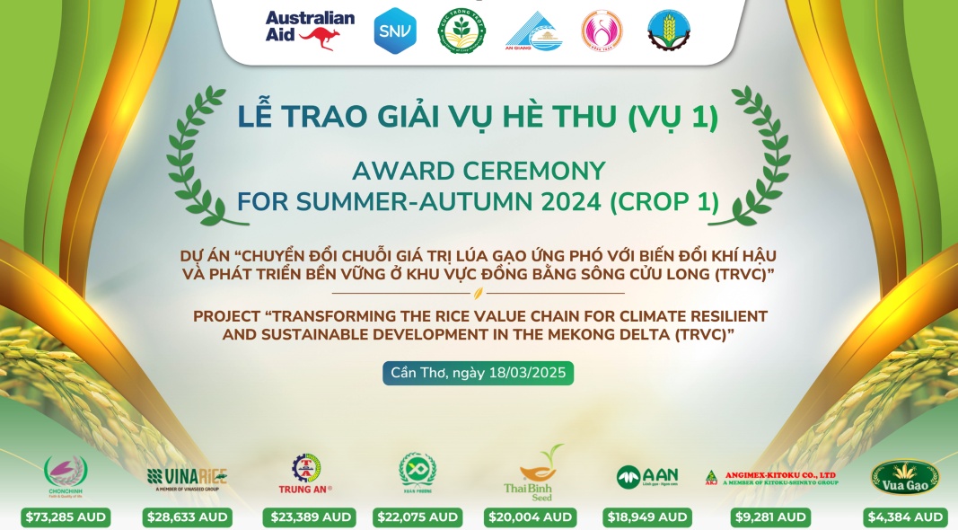 Lễ Trao Giải Dự Án TRVC đánh dấu một cột mốc quan trọng trong hành trình chuyển đổi chuỗi giá trị lúa gạo hướng tới nông nghiệp bền vững.